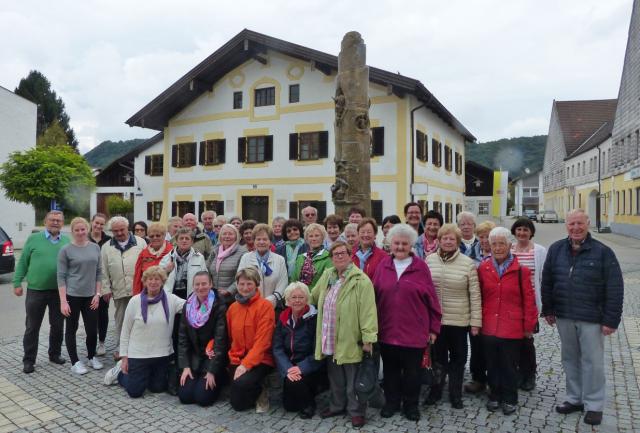 Hauptbild oben: Die Pfarreiengruppe an der Benediktsäule vor dem Geburtshaus, ganz links Herr Pfarrer Kaiser, Marktl, 2.v.r. Führerin Christa Moser