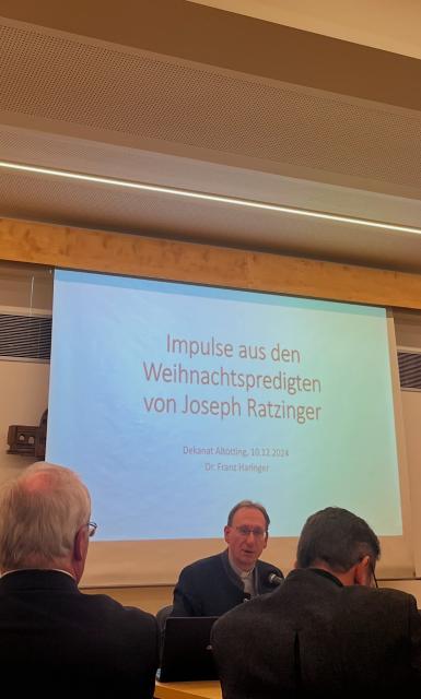 Dr. Franz Haringer war am 10. Dezember 2024 zu Gast beim monatlichen Treffen der Priester, Diakone und hauptamtlichen Mitarbeiterinnen und Mitarbeiter des Dekanates Altötting. Auf Einladung von Dekan Heribert Schauer hielt er im Altöttinger Franziskushaus einen geistlichen Vortrag über das Thema "Impulse aus den Weihnachtspredigten von Joseph Ratzinger". Im Mittelpunkt standen Predigten, die Joseph Ratzinger vor seiner Wahl zum Papst am Weihnachtstag und am Dreikönigstag gehalten hatte.